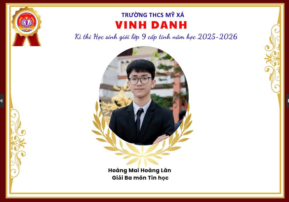 Môn Tin học – Là bộ môn làm chủ kỷ nguyên công nghệ số Sự sáng tạo kết hợp cùng những dòng code đã tạo nên sức mạnh của trí tuệ hiện đại. Em Hoàng Mai Hoàng Lân (lớp 9A2) đạt giải Ba, đã khẳng định bản lĩnh của thế hệ trẻ Mỹ Xá trong việc làm chủ công nghệ tương lai dưới sự dẫn dắt của cô giáo Nguyễn Thị Xuyến.