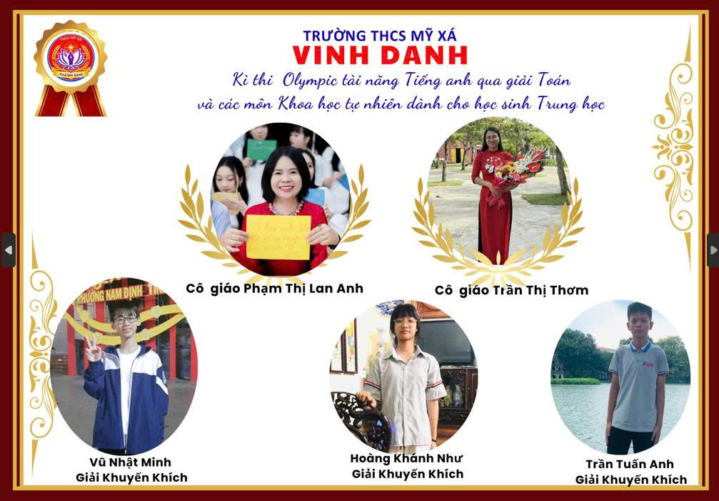 - Cuộc thi Olympic Tài năng tiếng Anh qua giải Toán và các môn Khoa học tự nhiên: Đây là sân chơi trí tuệ kết hợp giữa năng lực ngoại ngữ và tư duy khoa học, giúp học sinh vận dụng linh hoạt kiến thức Toán và các môn Khoa học tự nhiên bằng tiếng Anh. Dưới sự hướng dẫn tận tâm cô giáo Phạm Thị Lan Anh và cô giáo Trần Thị Thơm, các em học sinh đã đạt được kết quá đáng ghi nhận: Vũ Nhật Minh (lớp 8A1), Trần Tuấn Anh (lớp 8A2), Hoàng Khánh Như (lớp 8A1) đều đạt giải Khuyến khích.